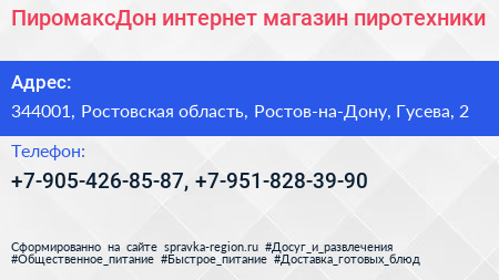 ПиромаксДон, интернет-магазин пиротехники по адресу 344001, Ростовская область, Ростов-на-Дону, Гусева, 2 в дальнейшем Организация, размещена в следующих категориях: