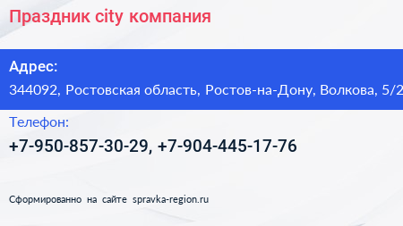 Праздник city, компания по адресу 344092, Ростовская область, Ростов-на-Дону, Волкова, 5/2 в дальнейшем Организация, размещена в следующих категориях:
