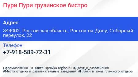Пури Пури, грузинское бистро по адресу 344002, Ростовская область, Ростов-на-Дону, Соборный переулок, 22 в дальнейшем Организация, размещена в следующих категориях:
