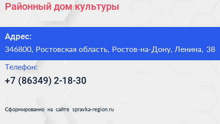 Районный дом культуры по адресу 346800, Ростовская область, Ростов-на-Дону, Ленина, 38 в дальнейшем Организация, размещена в следующих категориях: