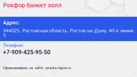 Рокфор, банкет-холл по адресу 344025, Ростовская область, Ростов-на-Дону, 40-я линия, 5 в дальнейшем Организация, размещена в следующих категориях: