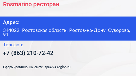 Rosmarino, ресторан по адресу 344022, Ростовская область, Ростов-на-Дону, Суворова, 91 в дальнейшем Организация, размещена в следующих категориях:
