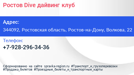 Ростов-Dive, дайвинг-клуб по адресу 344092, Ростовская область, Ростов-на-Дону, Волкова, 22 в дальнейшем Организация, размещена в следующих категориях: