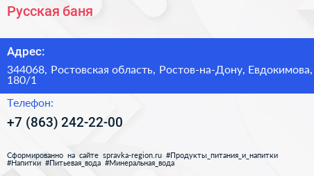 Русская баня по адресу 344068, Ростовская область, Ростов-на-Дону, Евдокимова, 180/1 в дальнейшем Организация, размещена в следующих категориях: