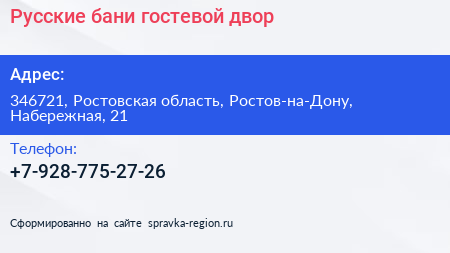 Русские бани, гостевой двор по адресу 346721, Ростовская область, Ростов-на-Дону, Набережная, 21 в дальнейшем Организация, размещена в следующих категориях: