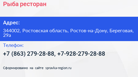 Рыба, ресторан по адресу 344002, Ростовская область, Ростов-на-Дону, Береговая, 29а в дальнейшем Организация, размещена в следующих категориях: