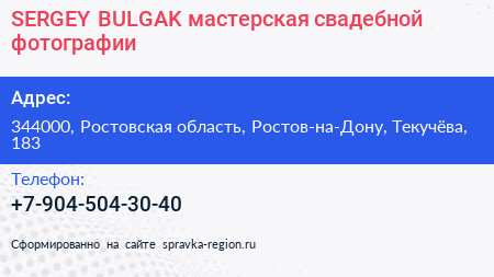 SERGEY BULGAK, мастерская свадебной фотографии по адресу 344000, Ростовская область, Ростов-на-Дону, Текучёва, 183 в дальнейшем Организация, размещена в следующих категориях: