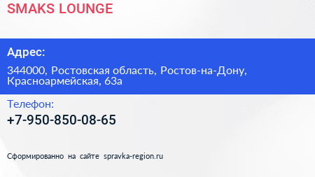 SMAKS LOUNGE по адресу 344000, Ростовская область, Ростов-на-Дону, Красноармейская, 63а в дальнейшем Организация, размещена в следующих категориях: