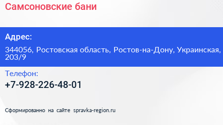 Самсоновские бани по адресу 344056, Ростовская область, Ростов-на-Дону, Украинская, 203/9 в дальнейшем Организация, размещена в следующих категориях: