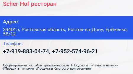 Scher Hof, ресторан по адресу 344015, Ростовская область, Ростов-на-Дону, Ерёменко, 58/12 в дальнейшем Организация, размещена в следующих категориях: