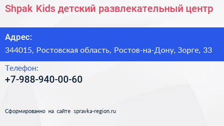 Shpak Kids, детский развлекательный центр по адресу 344015, Ростовская область, Ростов-на-Дону, Зорге, 33 в дальнейшем Организация, размещена в следующих категориях: