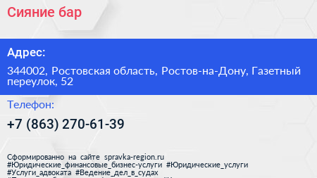 Сияние, бар по адресу 344002, Ростовская область, Ростов-на-Дону, Газетный переулок, 52 в дальнейшем Организация, размещена в следующих категориях:
