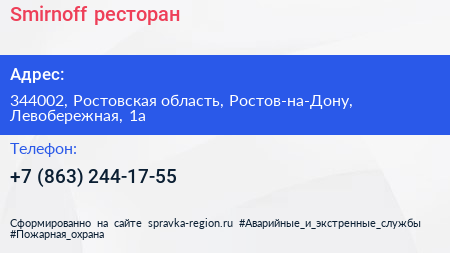 Smirnoff, ресторан по адресу 344002, Ростовская область, Ростов-на-Дону, Левобережная, 1а в дальнейшем Организация, размещена в следующих категориях: