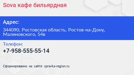 Sova, кафе-бильярдная по адресу 344090, Ростовская область, Ростов-на-Дону, Малиновского, 54в в дальнейшем Организация, размещена в следующих категориях: