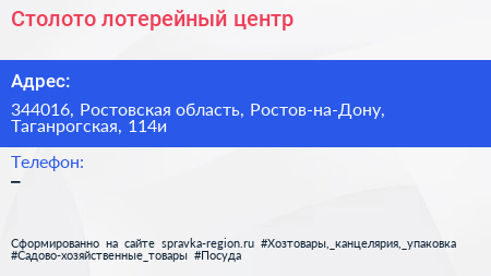 Столото, лотерейный центр по адресу 344016, Ростовская область, Ростов-на-Дону, Таганрогская, 114и в дальнейшем Организация, размещена в следующих категориях: