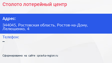 Столото, лотерейный центр по адресу 344045, Ростовская область, Ростов-на-Дону, Лелюшенко, 4 в дальнейшем Организация, размещена в следующих категориях: