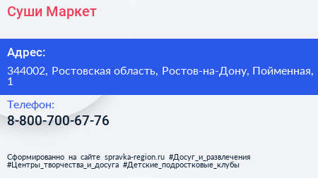 Суши-Маркет по адресу 344002, Ростовская область, Ростов-на-Дону, Пойменная, 1 в дальнейшем Организация, размещена в следующих категориях:
