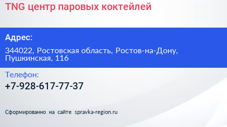 TNG, центр паровых коктейлей по адресу 344022, Ростовская область, Ростов-на-Дону, Пушкинская, 116 в дальнейшем Организация, размещена в следующих категориях: