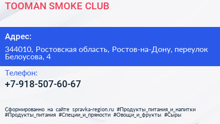 TOOMAN.SMOKE.CLUB по адресу 344010, Ростовская область, Ростов-на-Дону, переулок Белоусова, 4 в дальнейшем Организация, размещена в следующих категориях: