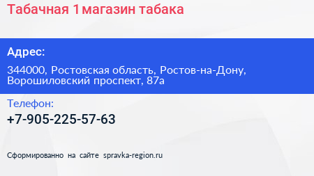 Табачная №1, магазин табака по адресу 344000, Ростовская область, Ростов-на-Дону, Ворошиловский проспект, 87а в дальнейшем Организация, размещена в следующих категориях: