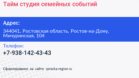 Тайм, студия семейных событий по адресу 344041, Ростовская область, Ростов-на-Дону, Мичуринская, 104 в дальнейшем Организация, размещена в следующих категориях:
