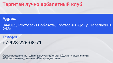 Таргитай, лучно-арбалетный клуб по адресу 344011, Ростовская область, Ростов-на-Дону, Черепахина, 243а в дальнейшем Организация, размещена в следующих категориях: