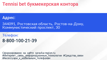 Tennisi bet, букмекерская контора по адресу 344091, Ростовская область, Ростов-на-Дону, Коммунистический проспект, 30 в дальнейшем Организация, размещена в следующих категориях: