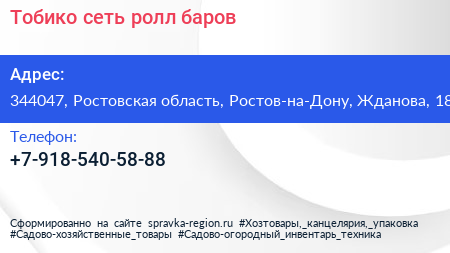 Тобико, сеть ролл-баров по адресу 344047, Ростовская область, Ростов-на-Дону, Жданова, 18 в дальнейшем Организация, размещена в следующих категориях: