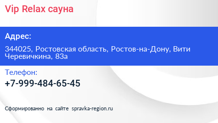Vip Relax, сауна по адресу 344025, Ростовская область, Ростов-на-Дону, Вити Черевичкина, 83а в дальнейшем Организация, размещена в следующих категориях: