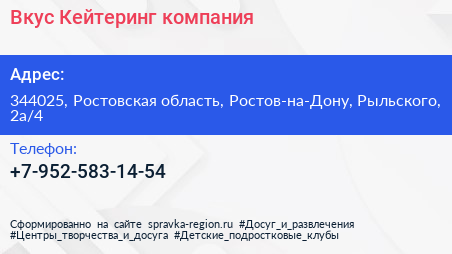 Вкус-Кейтеринг, компания по адресу 344025, Ростовская область, Ростов-на-Дону, Рыльского, 2а/4 в дальнейшем Организация, размещена в следующих категориях: