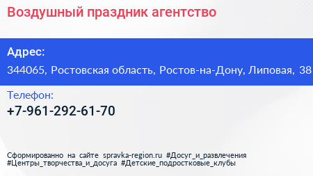 Воздушный праздник, агентство по адресу 344065, Ростовская область, Ростов-на-Дону, Липовая, 38 в дальнейшем Организация, размещена в следующих категориях: