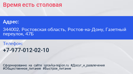 Время есть, столовая по адресу 344002, Ростовская область, Ростов-на-Дону, Газетный переулок, 47Б в дальнейшем Организация, размещена в следующих категориях: