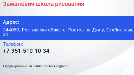 Замалевич, школа рисования по адресу 344090, Ростовская область, Ростов-на-Дону, Стабильная, 21 в дальнейшем Организация, размещена в следующих категориях: