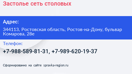 Застолье, сеть столовых по адресу 344113, Ростовская область, Ростов-на-Дону, бульвар Комарова, 28е в дальнейшем Организация, размещена в следующих категориях: