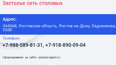 Застолье, сеть столовых по адресу 344068, Ростовская область, Ростов-на-Дону, Евдокимова, 102Б в дальнейшем Организация, размещена в следующих категориях: