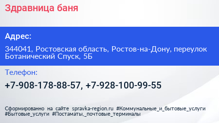 Здравница, баня по адресу 344041, Ростовская область, Ростов-на-Дону, переулок Ботанический Спуск, 5Б в дальнейшем Организация, размещена в следующих категориях: