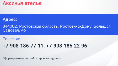 Аксинья, ателье по адресу 344002, Ростовская область, Ростов-на-Дону, Большая Садовая, 46 в дальнейшем Организация, размещена в следующих категориях: