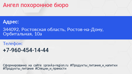 Ангел, похоронное бюро по адресу 344092, Ростовская область, Ростов-на-Дону, Орбитальная, 10а в дальнейшем Организация, размещена в следующих категориях:
