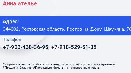 Анна, ателье по адресу 344002, Ростовская область, Ростов-на-Дону, Шаумяна, 78 в дальнейшем Организация, размещена в следующих категориях: