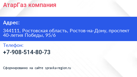 АтарГаз, компания по адресу 344111, Ростовская область, Ростов-на-Дону, проспект 40-летия Победы, 95/6 в дальнейшем Организация, размещена в следующих категориях:
