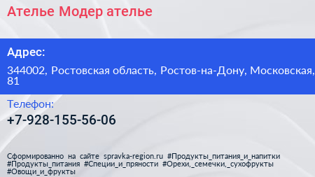 Ателье Модер, ателье по адресу 344002, Ростовская область, Ростов-на-Дону, Московская, 81 в дальнейшем Организация, размещена в следующих категориях: