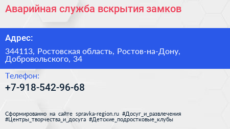 Аварийная служба вскрытия замков по адресу 344113, Ростовская область, Ростов-на-Дону, Добровольского, 34 в дальнейшем Организация, размещена в следующих категориях: