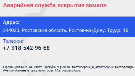 Аварийная служба вскрытия замков по адресу 344023, Ростовская область, Ростов-на-Дону, Труда, 18 в дальнейшем Организация, размещена в следующих категориях: