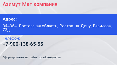Азимут-Мет, компания по адресу 344064, Ростовская область, Ростов-на-Дону, Вавилова, 73д в дальнейшем Организация, размещена в следующих категориях: