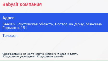 Babysit, компания по адресу 344002, Ростовская область, Ростов-на-Дону, Максима Горького, 151 в дальнейшем Организация, размещена в следующих категориях: