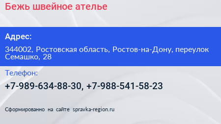 Бежь, швейное ателье по адресу 344002, Ростовская область, Ростов-на-Дону, переулок Семашко, 28 в дальнейшем Организация, размещена в следующих категориях: