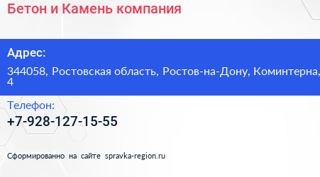 Бетон и Камень, компания по адресу 344058, Ростовская область, Ростов-на-Дону, Коминтерна, 4 в дальнейшем Организация, размещена в следующих категориях: