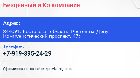 Безценный и Ко, компания по адресу 344091, Ростовская область, Ростов-на-Дону, Коммунистический проспект, 47а в дальнейшем Организация, размещена в следующих категориях: