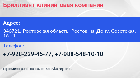 Бриллиант, клининговая компания по адресу 346721, Ростовская область, Ростов-на-Дону, Советская, 16 к1 в дальнейшем Организация, размещена в следующих категориях: