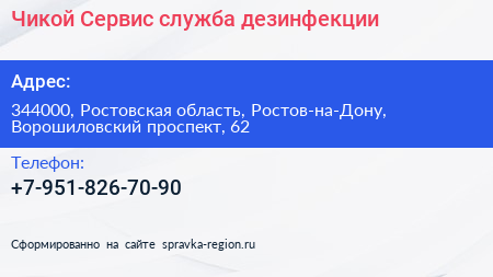 Чикой-Сервис, служба дезинфекции по адресу 344000, Ростовская область, Ростов-на-Дону, Ворошиловский проспект, 62 в дальнейшем Организация, размещена в следующих категориях: